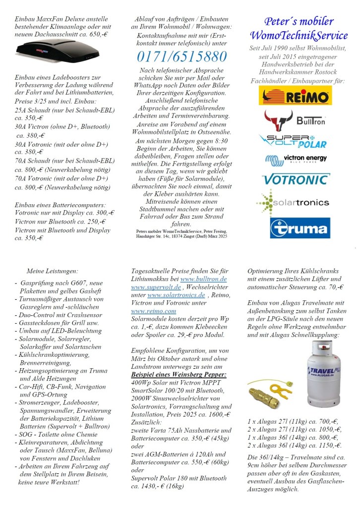 Meine Kunden besuchen mich auf dem Wohnmobilstellplatz „Gänsewiese“ in Ribnitz-Damgarten. Einfach einen Platz suchen und am Automaten das Ticket für die Übernachtung ziehen. Ich komme zu Ihnen.
